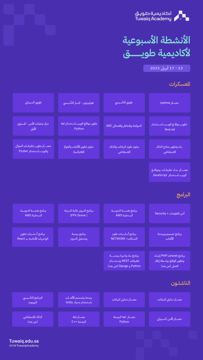 أعلنت أكاديمية طويق فتح باب التسجيل في عدة دورات ومعسكرات ودورات تدريبية مكثفة، تُقام حضوريًا في مقر الأكاديمية بمدينة الرياض، وذلك وفقًا للتفاصيل وطريقة التقديم الموضحة أدناه.